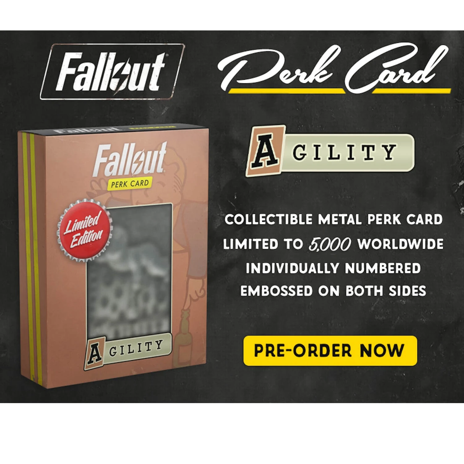 Own your very own replica perk card, this metal heavyweight card is highly detailed, embossed on both sides with a post-apocalyptic distressed finish. Limited to only 5,000 worldwide, each card is individually numbered. Venture out of your bunker and grab your very own Fallout collectible.