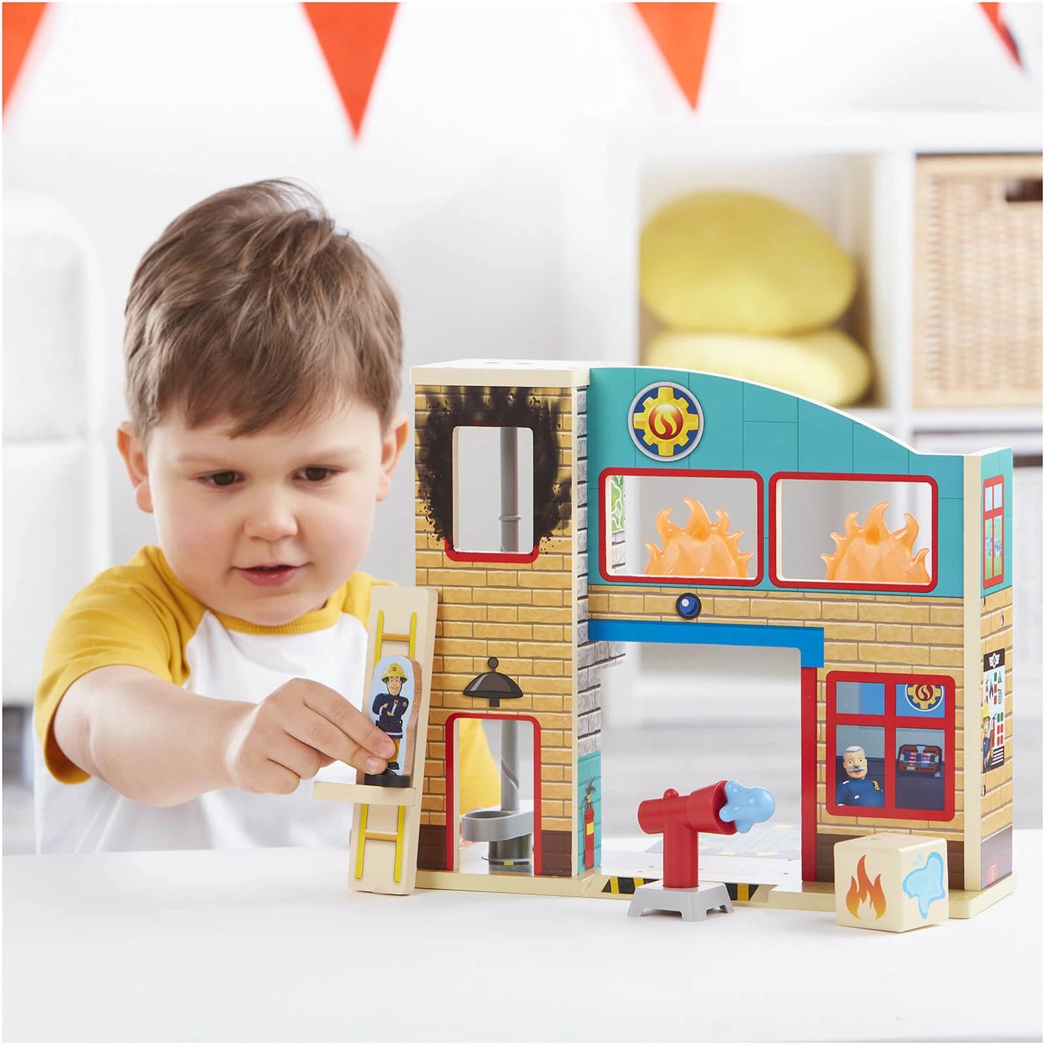 Time for some firefighting adventures! This double-sided, wooden playset features a: working firefighter’s pole, working water cannon, plus more! Classically styled with a scaled wooden, double-sided Firefighter Sam & Penny figure, pre-schoolers can make up their own fire station stories! The figures feature ‘drop & play’ feet for stability & promotes hand-eye coordination. The station is scaled for play with other Character Fireman Sam wooden toys. Made from environmentally responsible FSC® certified wood and suitable for children aged 3 years and over.