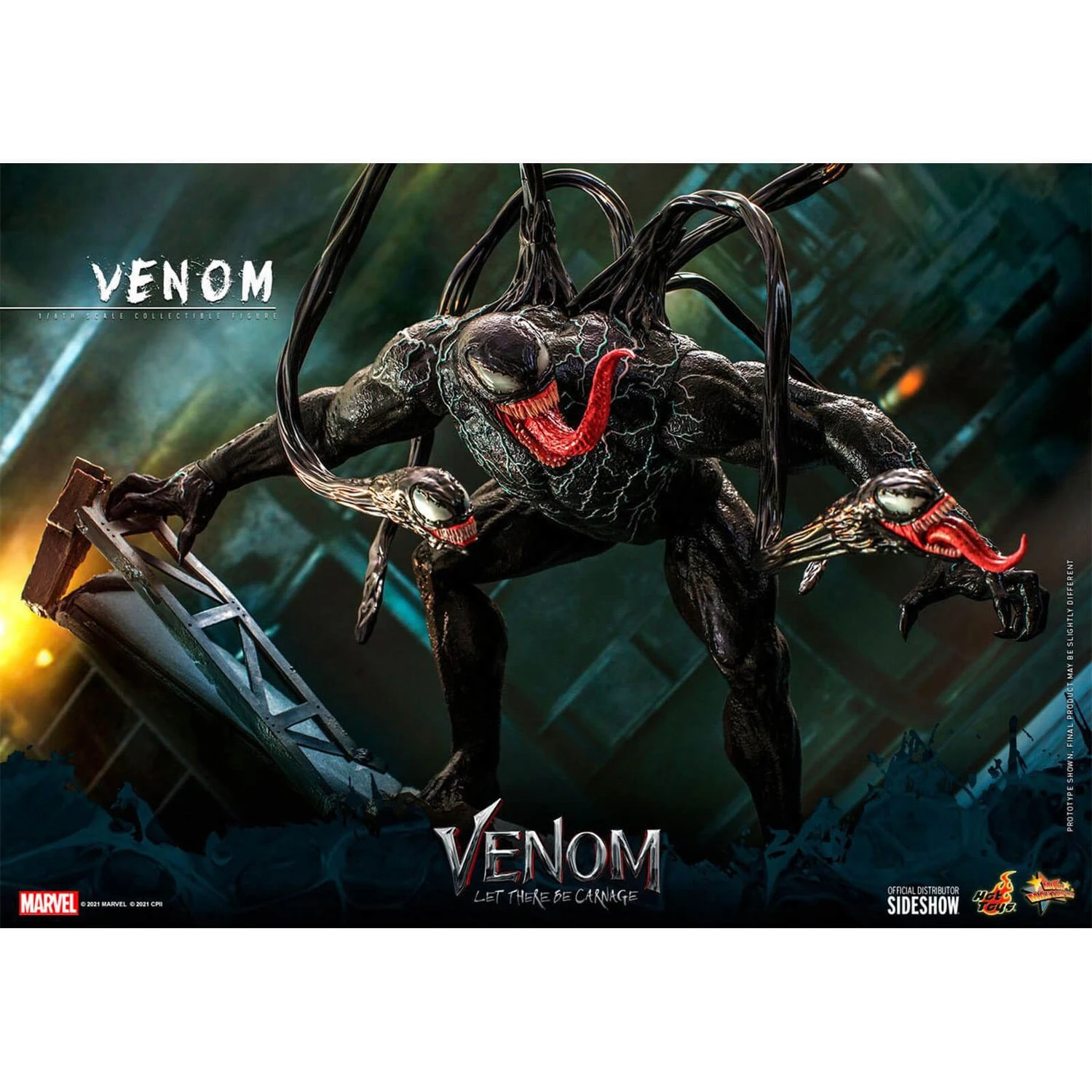 The greatly detailed collectible figure is skillfully crafted based on Venom from the Venom: Let There Be Carnage movie, and features a Venomized Eddie Brock head sculpt, a grinning head sculpt, a head sculpt with fanged mouth and three interchangeable protruding tongues; a specialized body measuring approximately 38cm tall showcasing a high level of detailed sculpting specially on the skin texture; beautifully painted in black polarized paint that gives a natural shiny glow from different viewing angles; interchangeable symbiote weapons and accessories including sickle, a number of symbiote accessories with tentacles attachable to figure’s back; a rod; specially crafted hands for poses; and a figure stand.
