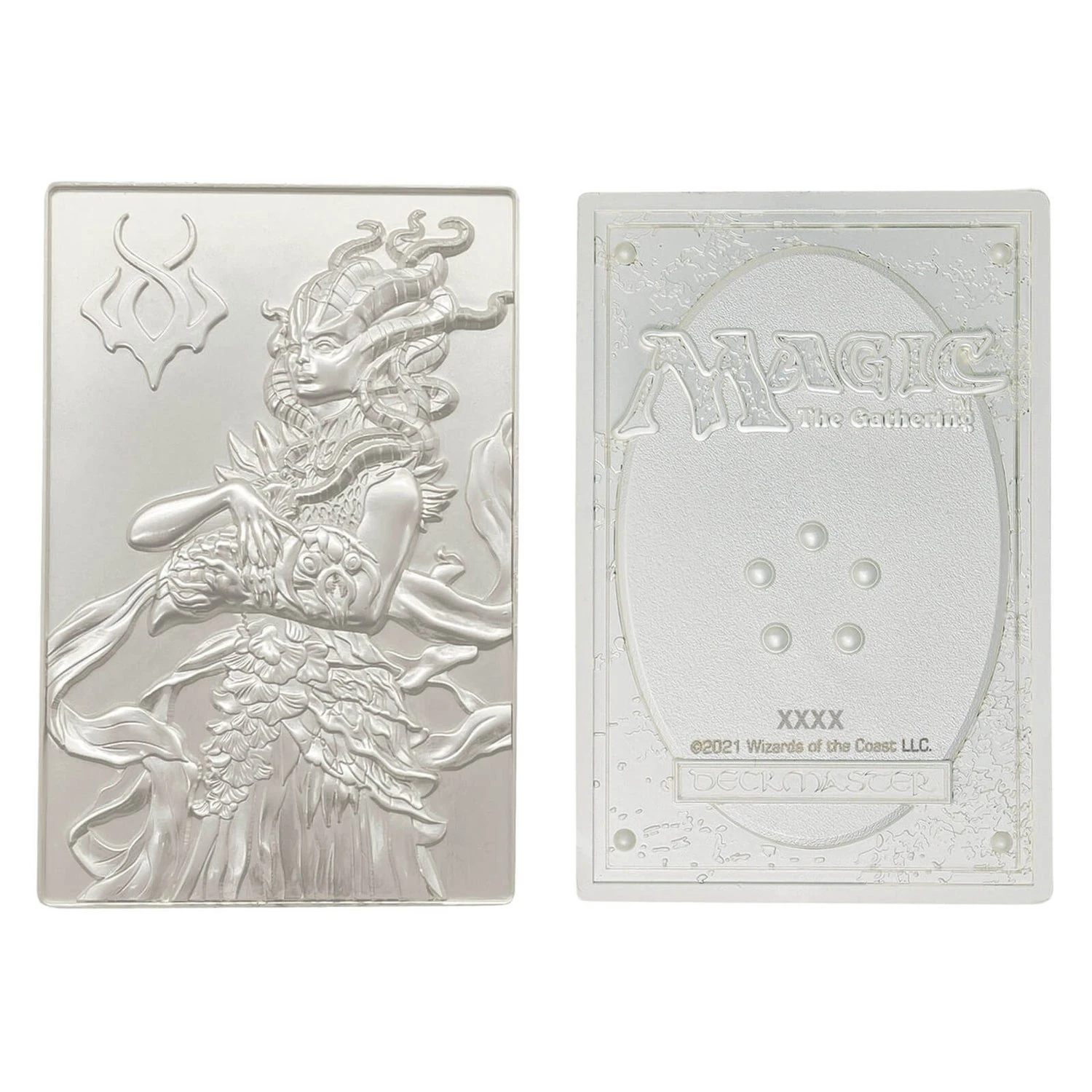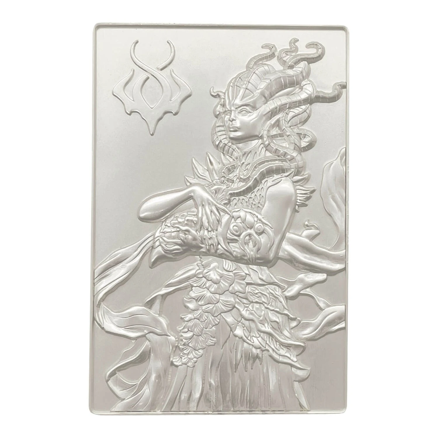 Featuring Vraska from Magic the Gathering, this .999 silver plated ingot is Limited to 5,000 worldwide, individually numbered, heavily embossed and detailed. Supplied with a display stand within its presentation box.