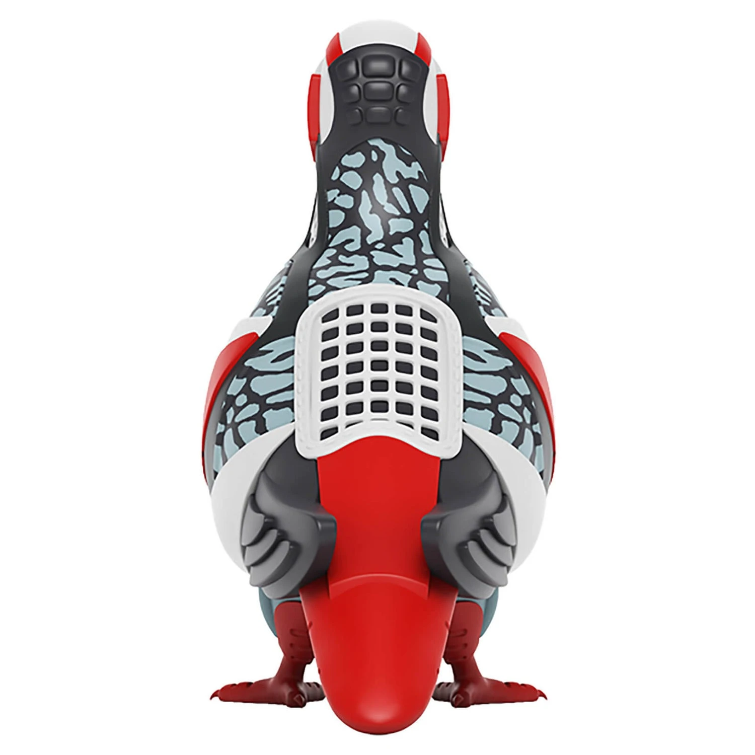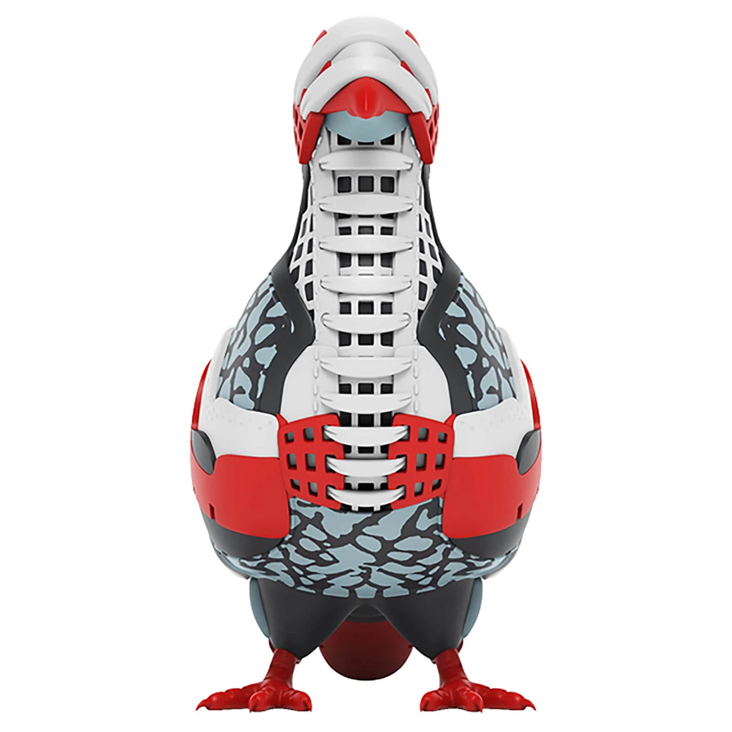 The texture-inspired patterns reference the different materials used in some of the world’s most popular sneakers. Key components in sneaker construction are also alluded to throughout the pigeon’s body—most noticeably shoelaces and grills. See if you can spot any others!