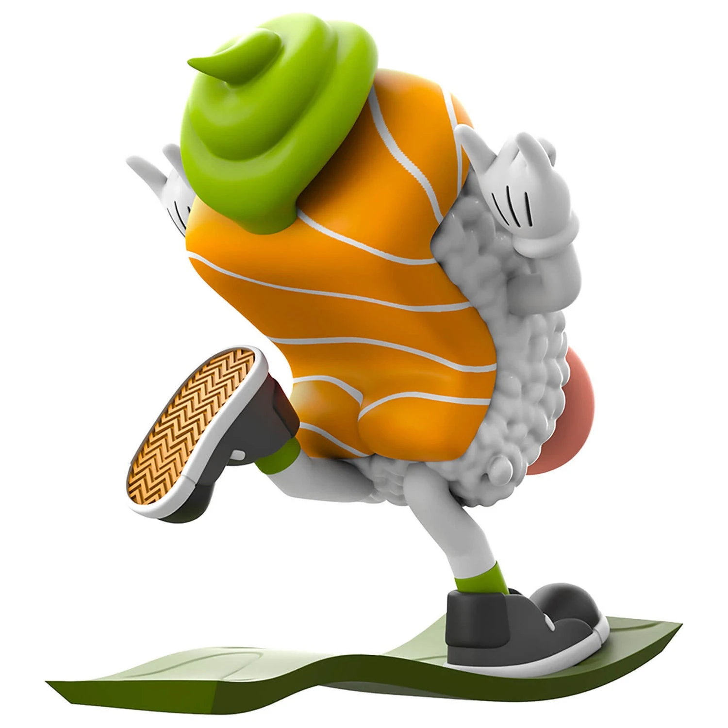 Originating from Mankeeboi’s illustration series ‚The Jumpin’ Seriesinch, Rock On! Sushi is a nigiri with interchangeable salmon and tuna (hair)cuts, held together with a stylish wasabi beanie. Raising hand-horns to the sky with his tongue out, he spots the coolest kicks and cruises on a piece of seaweed like a skateboard! Let’s‚ Rock On! Sushi!
