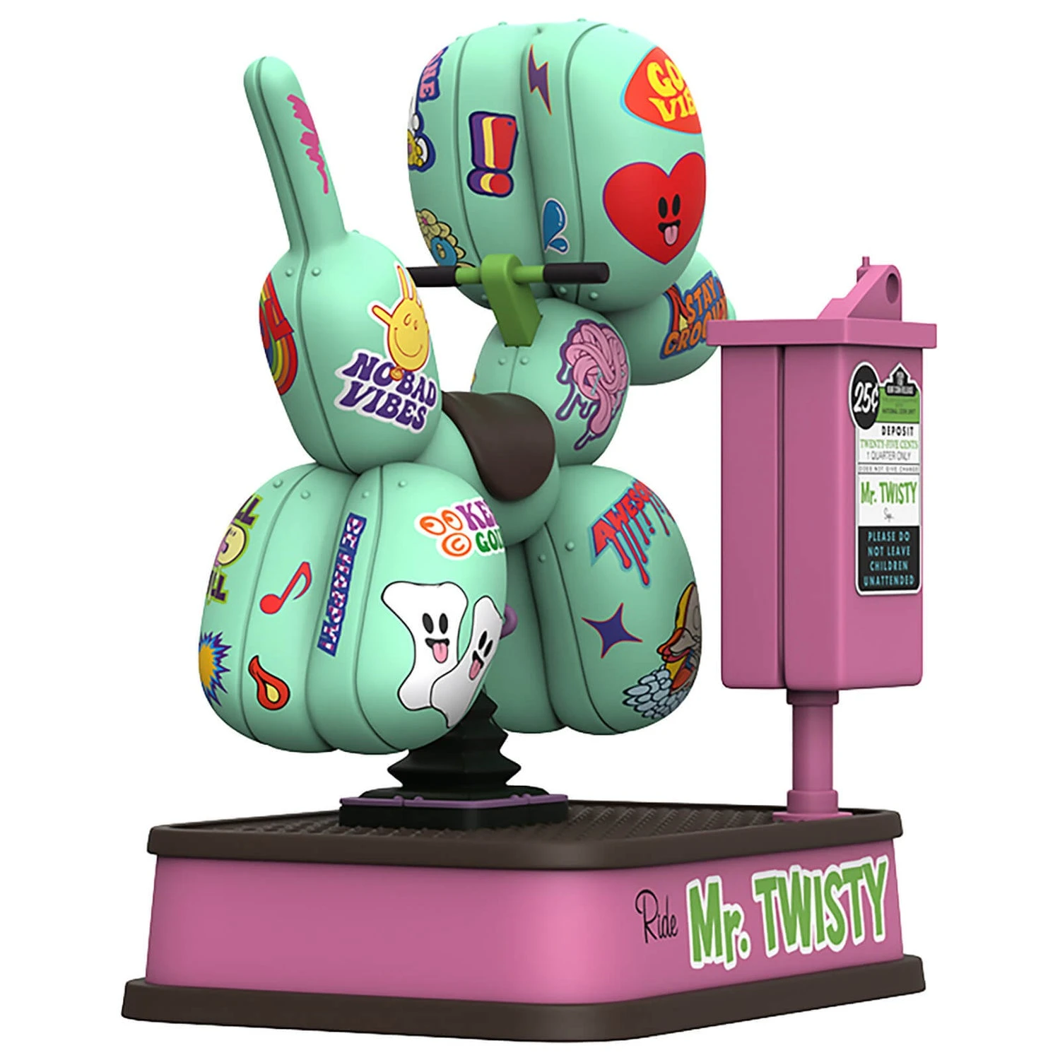Someone dropped a coin and Mr. Twisty by Jason Freeny is back in operation! Originally hand-sculpted by the artist using epoxy clay, this fun piece is reminiscent of the kiddie rides that filled many of our childhoods. Mr. Twisty (Vandalized Edition) features all its original details, with an addition of colorful decor left behind by young, playful riders, leaving it looking more vibrant than ever!